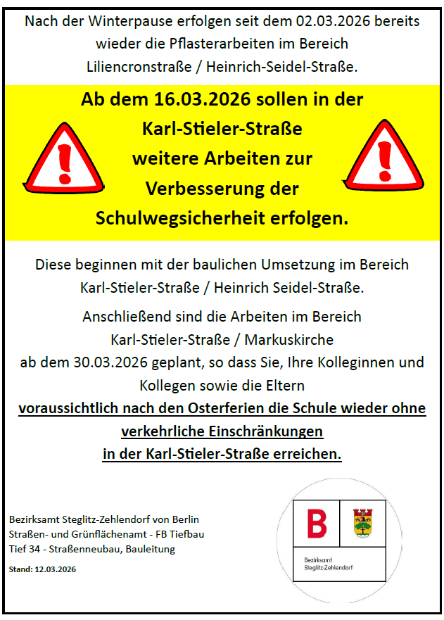 Grundschule am Stadtpark SteglitzKarl-Stieler-Straße 10-11, 12167 Berlin Steglitz-Zehlendorf – Tel.: 9395-1947, Fax: 9395-1946 |